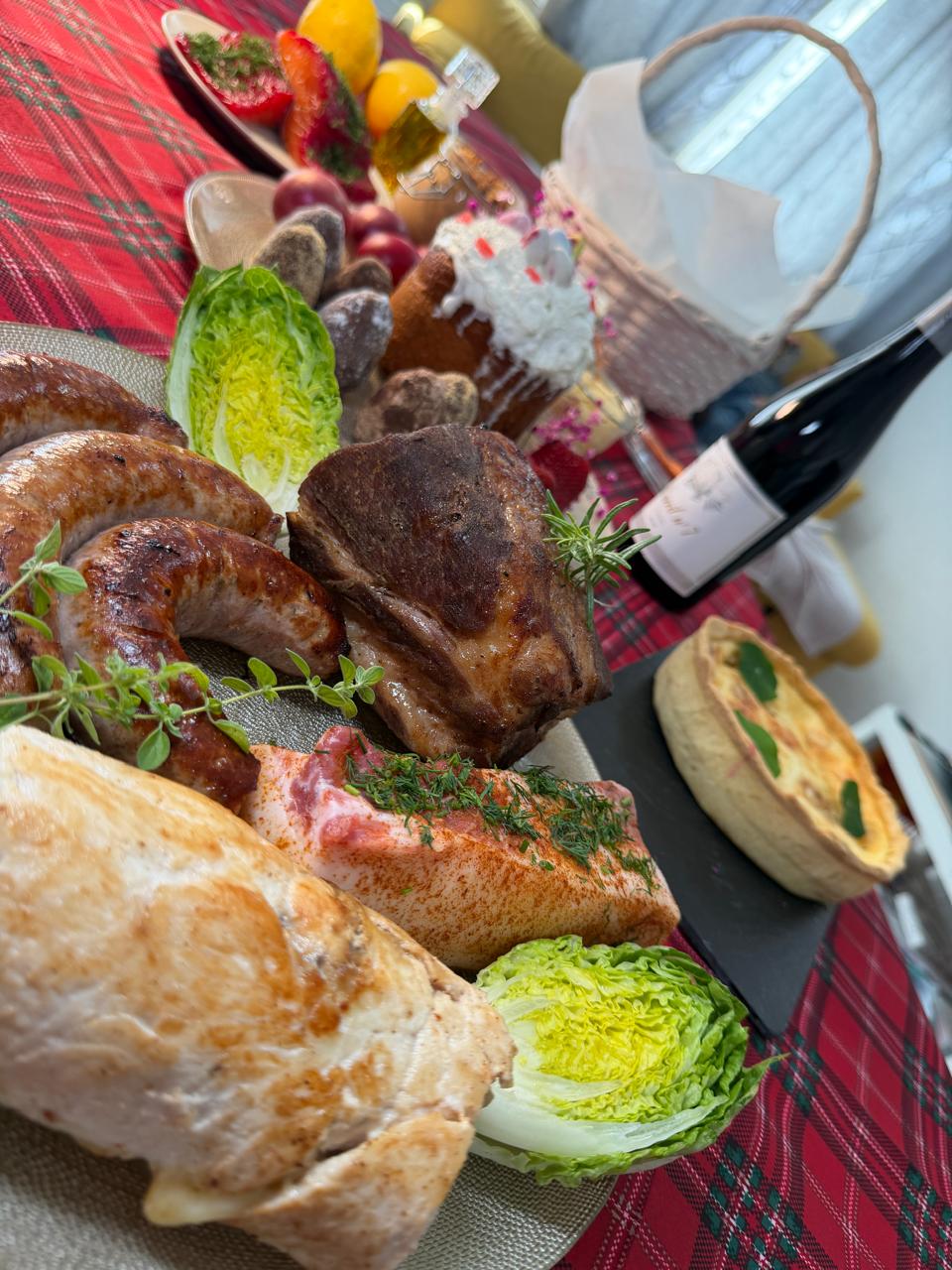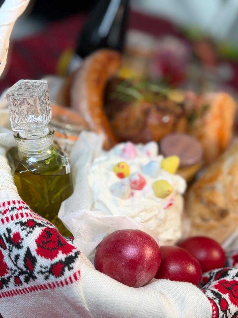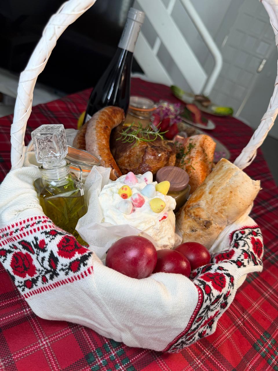 В составе:• Кулич — 800 г• Крашеные яйца — 6 шт• Запечённая буженина — 500 г• Домашняя колбаса — 400 г• Куриный рулет с грибами и сыром гауда — 400 г• Сало в травах, чесноке и перце — 300 г• Сливочный сыр — 170 г• Копчёное сливочное масло — 150 г• Паштет из куриной печени с луковым конфитюром — 350 г• Домашняя горчица — 50 г